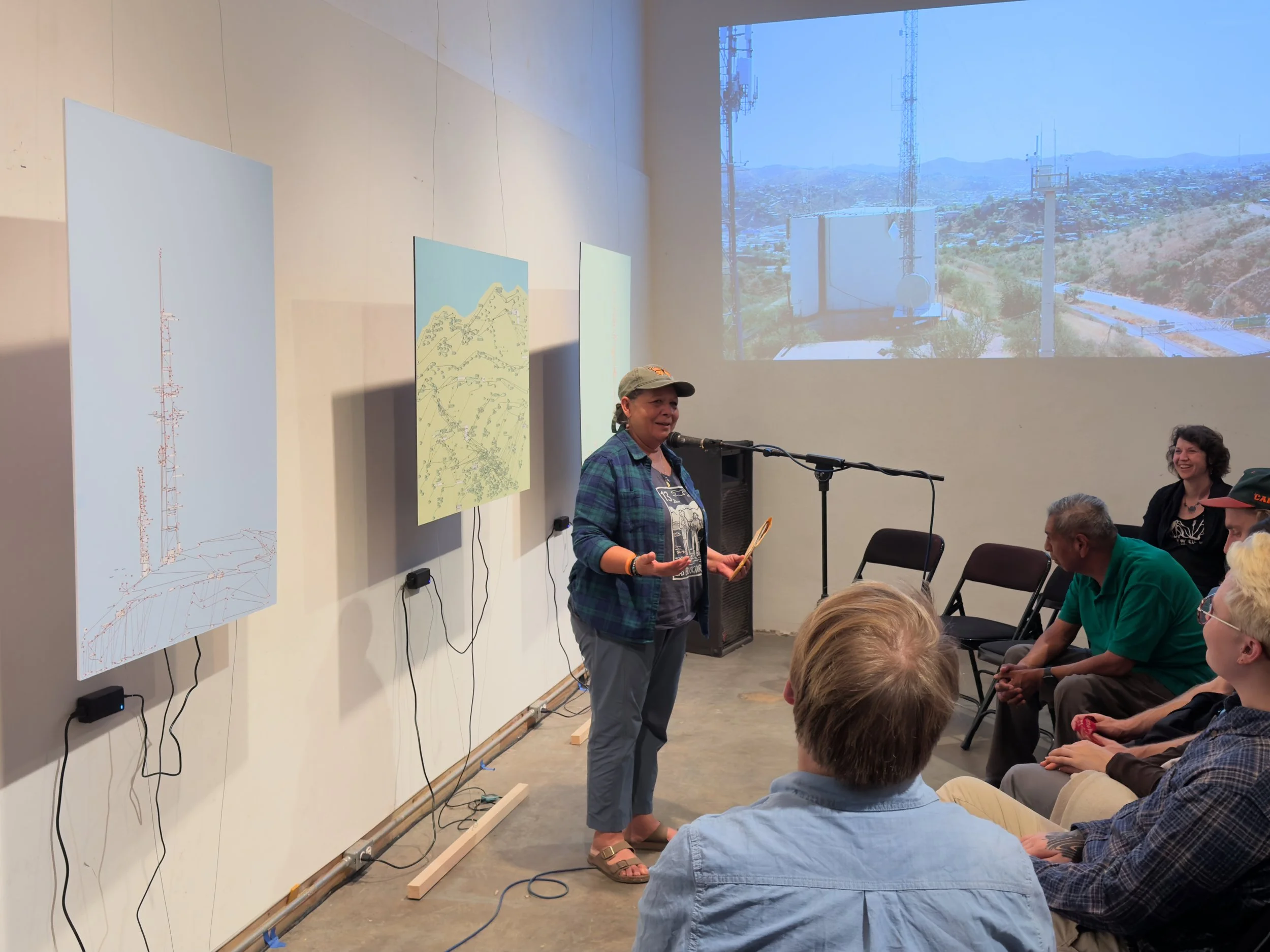 Hosted at Wave Archive in Tucson from October 2 to October 19, 2025, Border Signals functioned as a distinct yet connected iteration of The Ephemeralization Project. Much like the site-specific performance in Nogales, AZ, this exhibition interrogated the material realities underlying invisible systems, specifically focusing on the surveillance infrastructure of the US-Mexico borderlands. While Lines of Flight engaged directly with the physical border zone, Border Signals recreated those concerns within a gallery setting through three components—multimedia installation, drone videography, and a participatory poetry intervention.